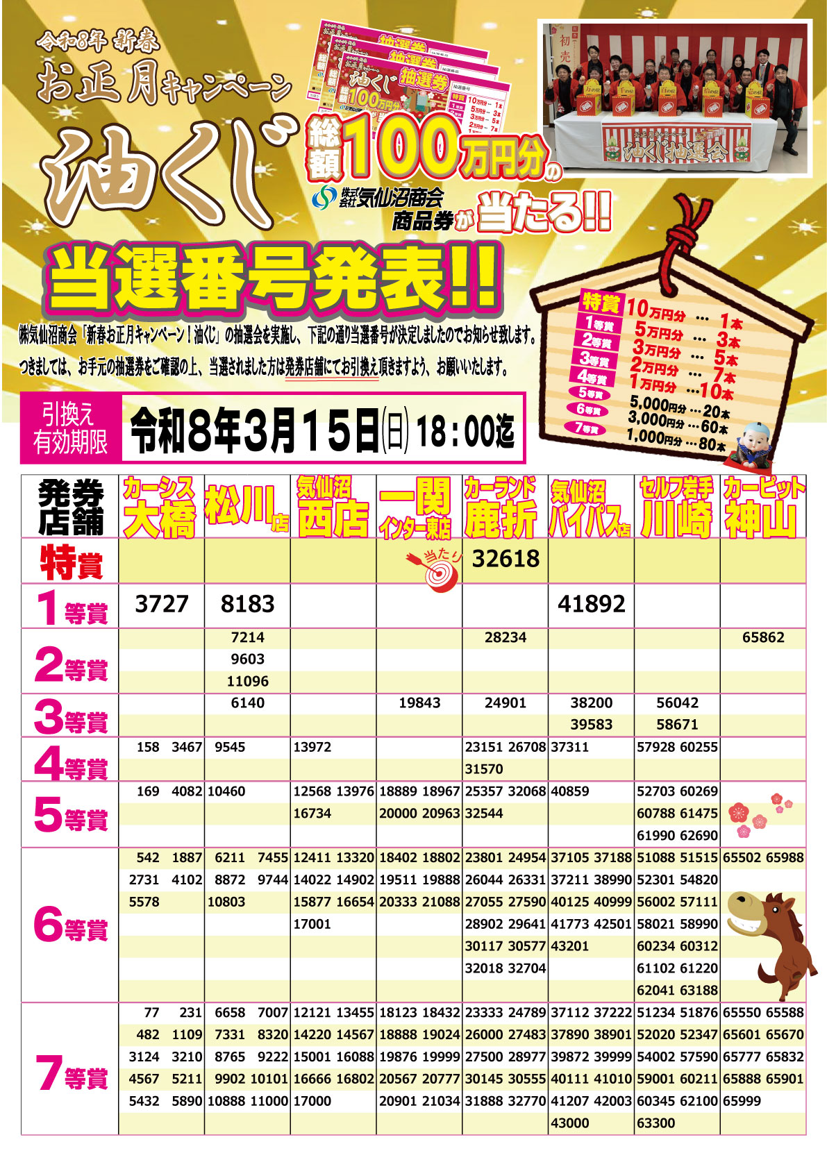 『令和8年 新春お正月キャンペーン!油くじ』当選番号発表!